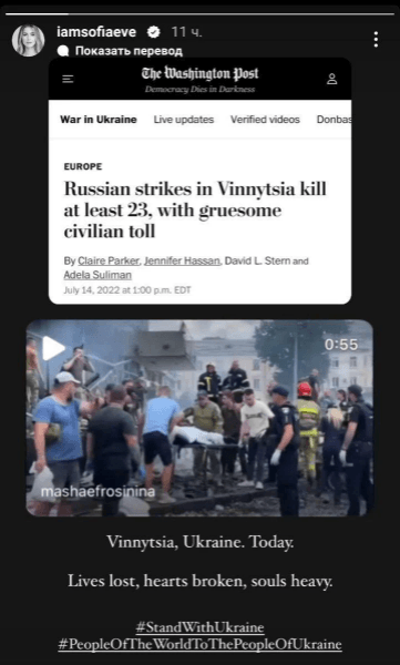 На те, що трапилося, відреагувала і внучка артистки Софія Євдокименко, яка живе та навчається в Нью-Йорку. 21-річна дівчина перепостила відео телеведучої Маші Єфросиніної з наслідками вибуху, а також опублікувала скриншот статті видання The Washington Post про те, що Росія вбила мирних людей у Вінниці.