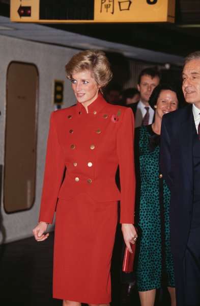 На цій фотографії, зробленій у 1989 році, прекрасна принцеса Вельська в червоному костюмі відвідує лікарню в Англії.