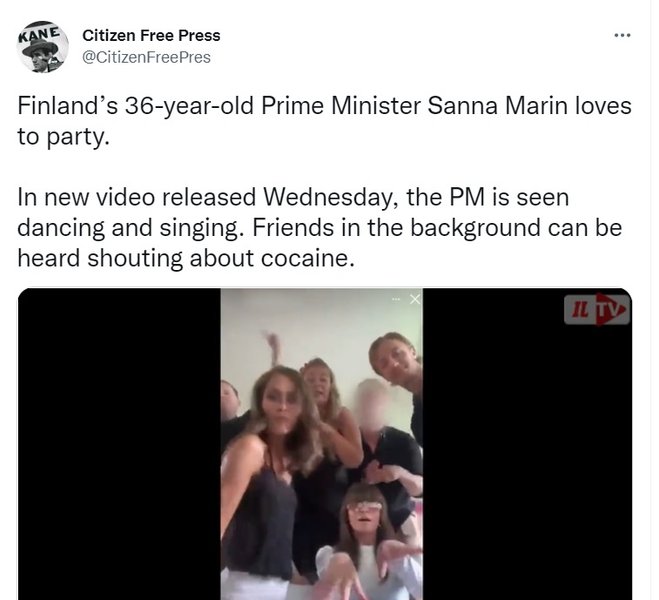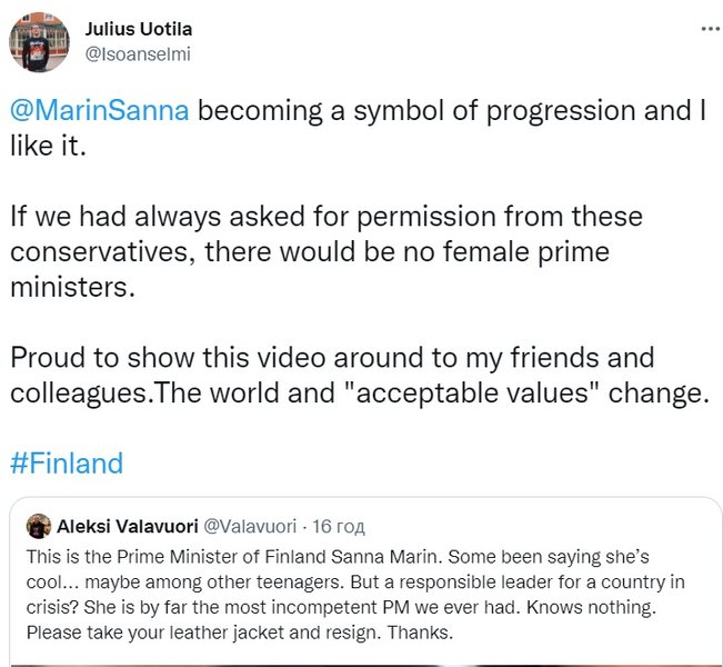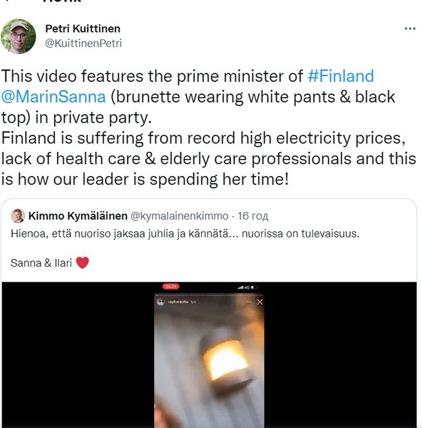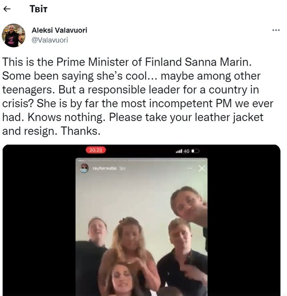 "Фінляндія страждає від рекордно високих цін на електроенергію, нестачі медичних працівників та фахівців з догляду за літніми людьми, і саме так проводить час наш лідер!", "36-річна прем'єр-міністр Фінляндії Санна Марін любить вечірки. У новому відео, випущеному в середу, прем'єр-міністр танцює і співає. На задньому плані чути крики друзів про кокаїн", "MarinSanna стає символом прогресу, і мені це подобається. Якби ми завжди питали дозволу у цих консерваторів, не було б жінок-прем'єр-міністрів. Пишаюся тим, що можу показати це відео своїм друзям та колегам. Світ та "прийнятні цінності" змінюються".