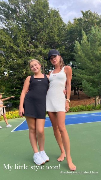 Дружина відомого футболіста Девіда Бекхема та 11-річна Гарпер позують в однакових тенісних мінісукнях. Проте Вікторія обрала білий варіант, а її дитина — чорний. На голові співачки красувалася чорна бейсболка, а у дівчинки на ногах були білі кросівки, то ж мама з донькою виглядали доволі гармонійно.