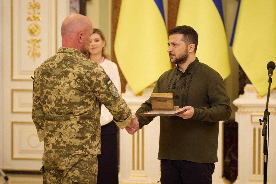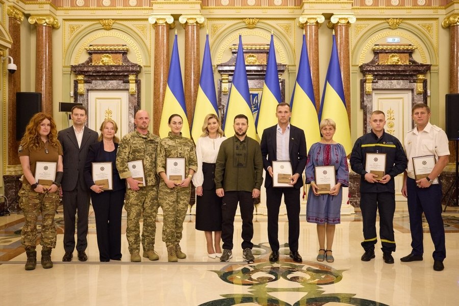 Спочатку президент України в обновці нагороджував лауреатів відзнаками "Національна легенда України", а потім у ній же записав своє щовечірнє звернення до народу 21 серпня на 180 день війни з Росією.
