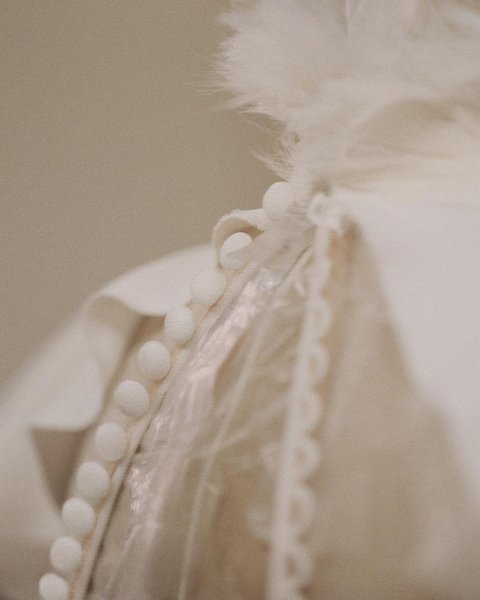 Також у Ralph Lauren показали, як виглядали приголомшливі сукні на стадії ескізу та деякі деталі обробки: ґудзички, обшиті шовком та комір із пір'я.
