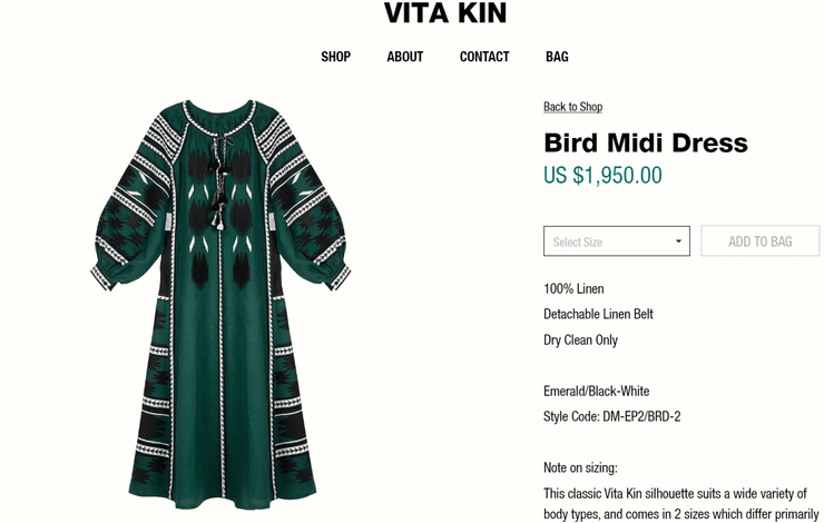 Українська дизайнерка Віта Кін відома колекціями одягу з національними мотивами. А сукня, схожа на вбрання Кейт Мосс, коштує на офіційному сайті бренду 1 950 доларів (понад 70 тисяч гривень).