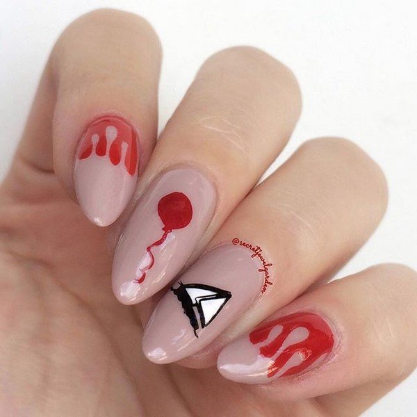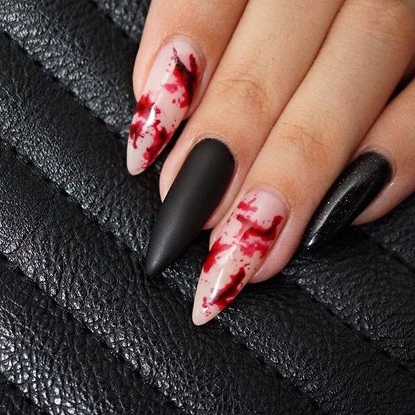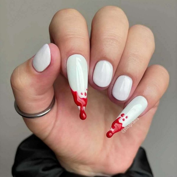 Тему вампіра на Гелловін не відігравав хіба що лінивий. Мабуть, це найвдячніший образ, оскільки можна "відірватися" по-повній, підібравши костюм якогось кровопивці, причому не обов'язково середньовічного, прикладів для наслідування вистачає й у найпопулярніших голлівудських фільмах. Гострі "криваві" нігті якнайкраще підійдуть для цього образу. Це може бути як однотонне бордово- або криваво-червоне покриття, так і френч із краплями крові замість посмішки на кінчику нігтя. Вибір за вами!