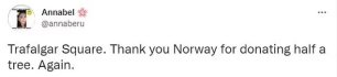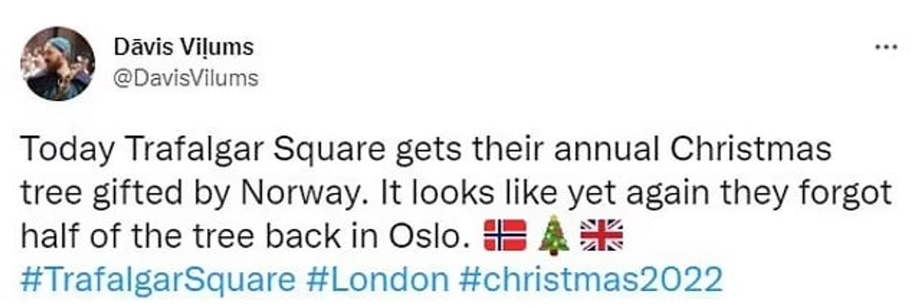 "Судячи з фотографій різдвяної ялинки на Трафальгарській площі, зрубаній минулого тижня в Норвегії і привезеній сьогодні, її перевозили в ручній поклажі рейсом Ryanair", "Щороку Осло відправляє різдвяну ялинку на Трафальгарську площу в подяку за нашу допомогу. Але я починаю думати, що, можливо, норвежці нас не так люблять", "Сьогодні Трафальгарська площа отримує свою щорічну ялинку, подаровану Норвегією. Схоже, вони знову забули половину дерева в Осло", — пишуть користувачі.