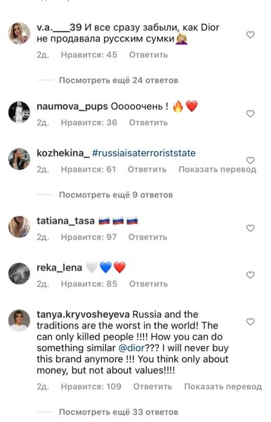 Автори деяких коментарів звинуватили Модний дім Dior у непрямій підтримці Росії.