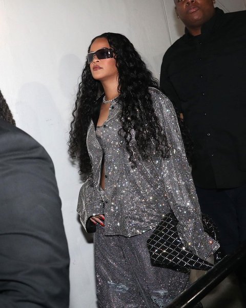 Тоді Ріанна була одягнена в мерехтливий костюм зі стразами від бренду Khaite Argo із весняної колекції 2023 року, який доповнила гламурною сумкою від цього бренду. Вона завершила образ срібними босоніжками, діамантовим кольє та великими чорними сонцезахисними окулярами.