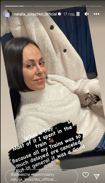 Зокрема Наталія Єгорова показала своє свіже фото з Берліна, де наразі проживає. Вона зазначила, що більшість дня провела в потязі.