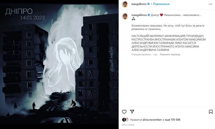 47-річний російський гуморист і телеведучий Максим Галкін, який через свою проукраїнську позицію змушений був разом із сім'єю виїхати з РФ, не залишився осторонь трагедії в Дніпрі, де 14 січня російська ракета знесла цілий під'їзд житлового будинку і забрала, за останніми даними, 40 життів. На сторінці в Instagram він опублікував малюнок із зображенням зруйнованого будинку і жінки, яка плаче й закрила руками обличчя.