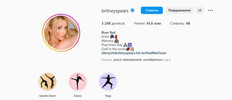 41-річна американська співачка Брітні Спірс повідомила своїм 41,6 млн підписникам в Instagram, що змінила ім'я на Рівер Ред, що в перекладі з англійської означає "червона річка". Своє нове ім'я вона закріпила у профілі.