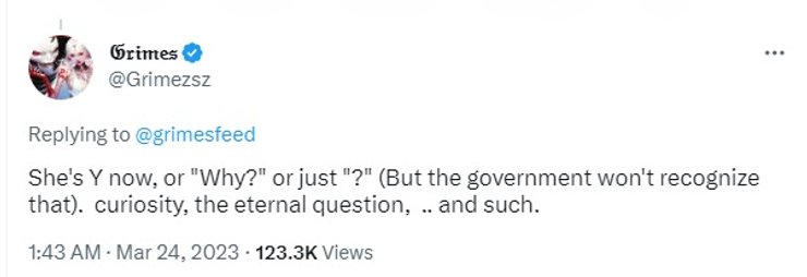 "Вона тепер Y, або "Чому?", або просто "?" (Але уряд цього не визнає). Цікавість, вічне питання… і так далі", — зазначила артистка.