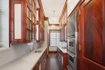 Просторий коридор включає жіночу кімнату і дві місткі вбиральні і веде в кабінет, обшитий фігурними дерев'яними панелями з анігре. Кухня-вітальня обладнана технікою преміумкласу від Sub-Zero та Viking, а під ногами – мармурова підлога з малюнком у клітинку. Промислові світильники 1930-х років звисають зі стелі з пресованої жерсті над стільницями з карарського мармуру та нержавіючої сталі. На кухні є виділена зона для сніданку зі стельовим вікном нагорі та акцентована стримана туалетна кімната. Французькі двері відчиняються на відкритий майданчик.