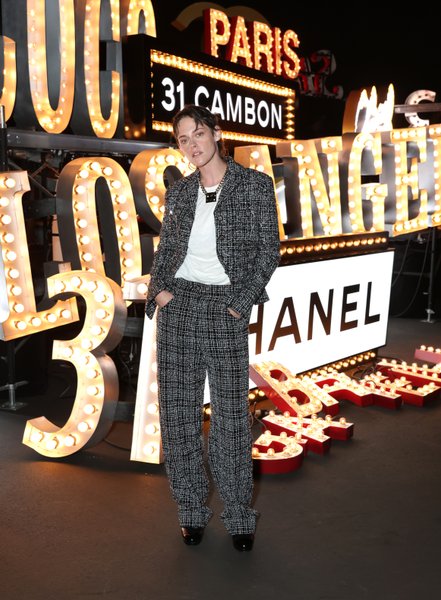 Зірка "Сутінок" прибула на вечірку Chanel Cruise 2023/24 у Chateau Marmont у Лос-Анджелесі в компанії своєї дівчини Ділан Меєр. Стюарт була в темно-сірому твідовому піджаку та штанах у тон. Під піджаком знаменитості була базова біла футболка. Вечірній аутфіт Крістен Стюарт доповнила квадратна підвіска, прикрашена знаковим подвійним логотипом C. На ногах зірки екрану були чорні лаковані туфлі.