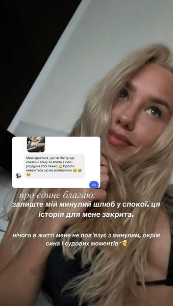"Про єдине благаю. Залиште мій минулий шлюб у спокої. Ця історія для мене закрита. Нічого в житті мене не пов'язує з минулим, окрім сина і судових моментів", — заявила блогерка.