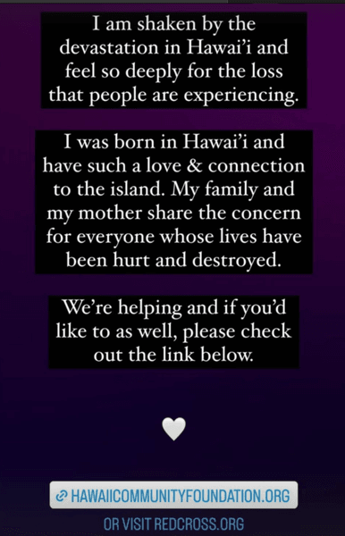 Зірка завершила: "Ми допомагаємо, і якщо ви також хочете, перейдіть за посиланням нижче", і надала посилання на Hawai'i Community Foundation, а також на сторінку Червоного Хреста.