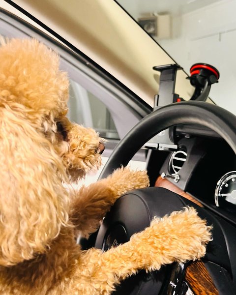 У собаки — світла кучерява шерсть, що нагадує волосся кінодіви. На одному з фото пес сидить за кермом її авто.