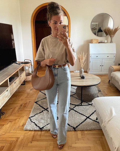 Цей мішкуватий образ з голови до ніг доводить, що вам не потрібно носити нічого обтислого, щоб мати зібраний вигляд. Футболка з написом і сумка через плече додадуть вашому джинсовому образу нотку 90-х.