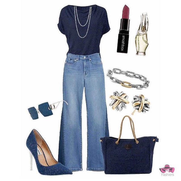 Це — класичний діловий ансамбль. Тут можна поєднувати укорочені джинси і блузу, частково заправлену в штани. Взуття на підборах додасть образу більше шику і жіночності. Доповнити його можна великою сумкою.