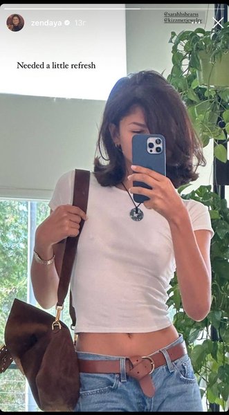 Дівчина Тома Голланда на новому фото у дзеркалі постала в білому топі та синіх джинсах з коричневим ременем. До серпневого аутфіту знаменитість додала коричневу сумочку та підвіску. Проте родзинкою луку акторки стала її нова зачіска: зірка екрану підстригла волосся та пофарбувала його в темніший відтінок.