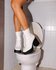 На знімку Кеті сидить у туалеті на унітазі, стягнувши труси, і робить селфі. На ній спідниця, подовжений приталений жакет, блакитна довга сорочка і шкарпетки.