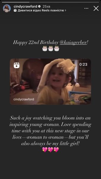 "З 22-річчям, @kaiagerber! Така радість спостерігати, як ти розквітаєш у молоду жінку. Люблю проводити час з тобою на цьому новому етапі нашого життя — жінка до жінки, але ти також завжди будеш моєю маленькою дівчинкою!" — звернулася до спадкоємиці культова модель.