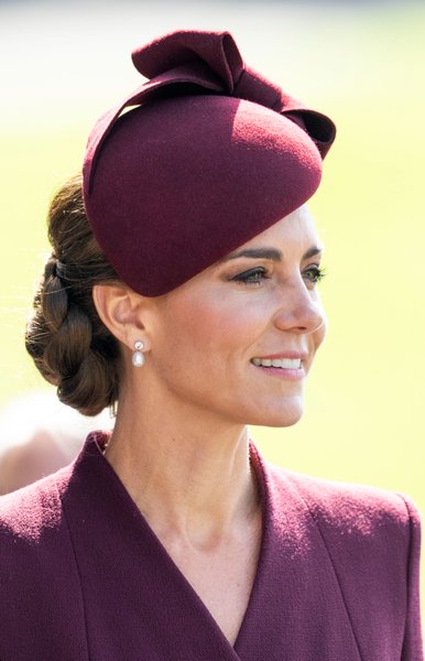 41-річна принцеса Уельська поєднала сережки з діамантами та перлами з бордовим пальтом від лондонського бренду Eponine та капелюшком у тон від Sahar Millinery. Мама трьох дітей доповнила образ сумкою Mulberry з перероблених матеріалів, яку вона демонструвала кілька разів з 2017 року, і туфлями на підборах Gianvito Rossi.