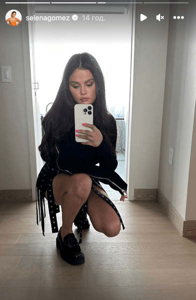 Гомес також продемонструвала свої підтягнуті ноги на іншій фотографії, яка була опублікована в її Instagram Story раніше того ж дня. На знімку Селена присіла, продемонструвавши інакше темне вбрання, яке включало модну куртку та шкіряні туфлі. Волосся американської знаменитості було розпущене.