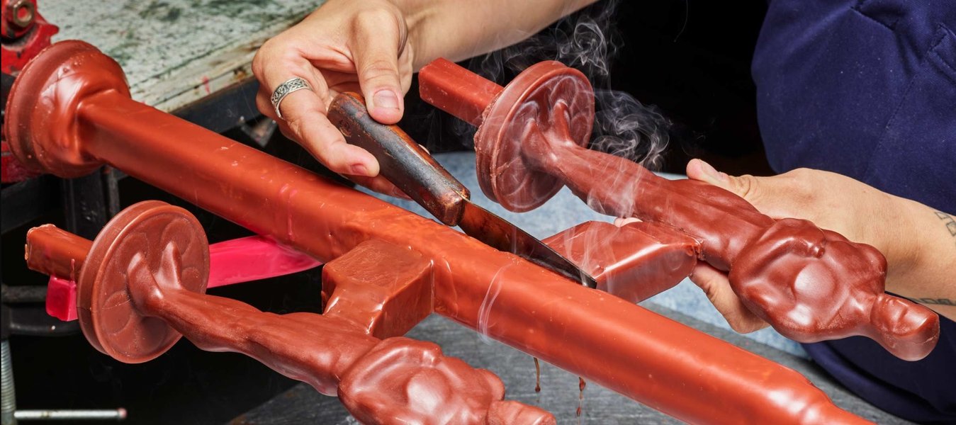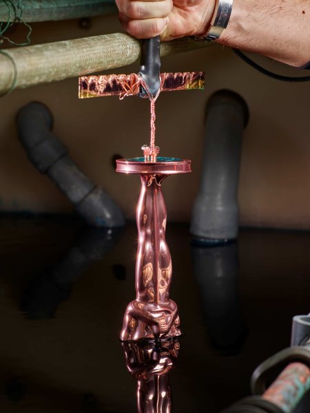 Далі все поміщається в піч, де віск виплавляється, а після залишається порожниста посудина — з ідеальним негативним відбитком статуетки. Потім кремнієву бронзу плавлять у тиглі й заливають туди, де раніше був віск. Це традиційний метод лиття за виплавлюваними моделями.