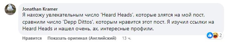 "Я знаходжу захопливим кількість "Heard Heads", які зляться на мій пост, порівняли число "Depp Dittos", яким подобається цей пост. Я вивчив посилання на Heard Heads і знайшов дуже, ах, цікаві профілі", — написав Крамер.