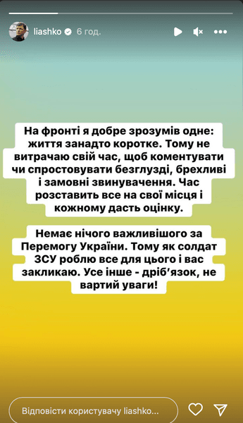 "На фронті я добре зрозумів одне: життя занадто коротке. Тому не витрачаю свій час, щоб коментувати або спростовувати безглузді, брехливі і замовні звинувачення. Час розставить все по своїх місцях і кожному дасть оцінку. Немає нічого важливішого за перемогу України. Тому як солдат ЗСУ роблю все для цього і вас закликаю. Все інше — дрібниці, які не варті уваги", — зазначив український політичний діяч.