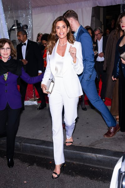 Сінді Кроуфорд тим часом дотримувалася класичного стилю у штанному костюмі молочного відтінку та шовковій блузці в тон. Вона доповнила вечірній лук сумочкою-клатчем від Ralph Lauren та темними туфлями з відкритим носом. Культова модель уклала волосся легкими хвилями та продемонструвала кілька прикрас, зокрема намисто.