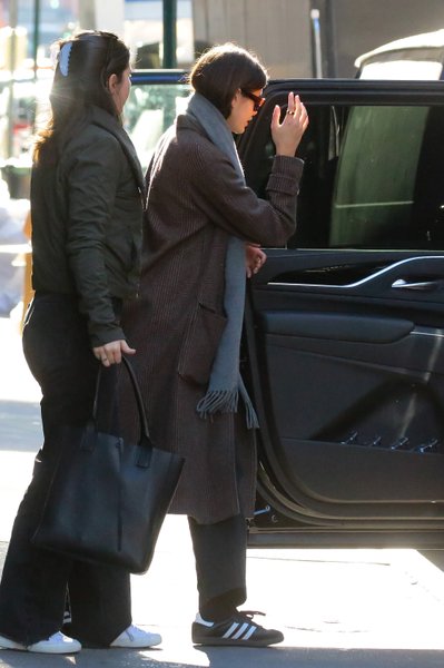 Юна зірка глянців зігрілася в довгому коричневому пальті. Під ним вона одягла сірий светр на ґудзиках, а коричневі сонцезахисні окуляри додали блиску до похмурого образу.