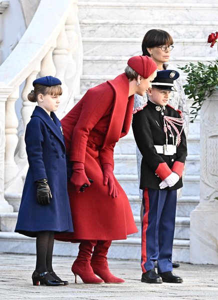 Тим часом княгиня Монако Шарлін продемонструвала розкішне червоне вбрання, яке складалося з пальта, берету та черевиків на підборах.