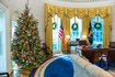 Як завжди, одним із яскравих моментів декору є Блакитна кімната, де виставлена офіційна різдвяна ялинка Білого дому. Цього року деревом є ялиця Фрейзера заввишки 18,5 футів, через яку довелося зняти люстру, щоб ялинка помістилася.