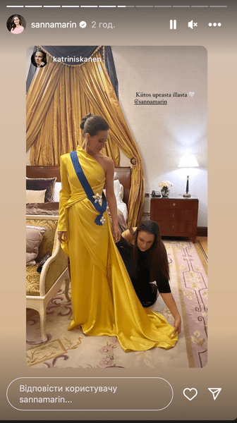 На одному з фото можна побачити, як 38-річна Санна Марін позує в жовтій сукні з атласної тканини з оголеним плечем. Сукню експремʼєр-міністерка доповнила синьою стрічкою, що створило образ українського прапора. Також Марін одягнула золоті масивні сережки та зібрала волосся в елегантну зачіску. Вона зробила легкий вечірній макіяж.