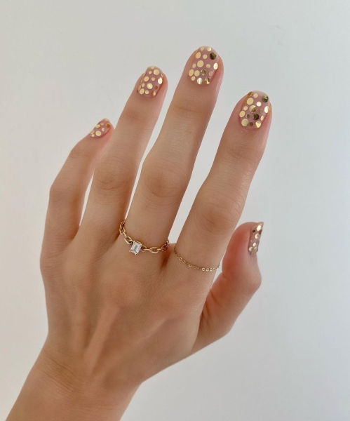 Додайте іскри нейтральному лаку, підкресливши кінчики та кутикулу ретельно розставленими золотими блискітками.