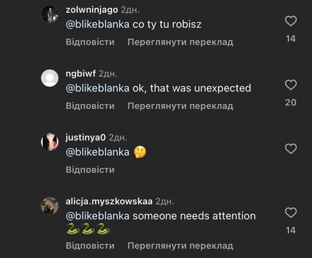 Зокрема, артистка коментує свіжі дописи свого ексконкурента. Втім, користувачі мережі різко відреагували на публічну любʼязність Blanka.