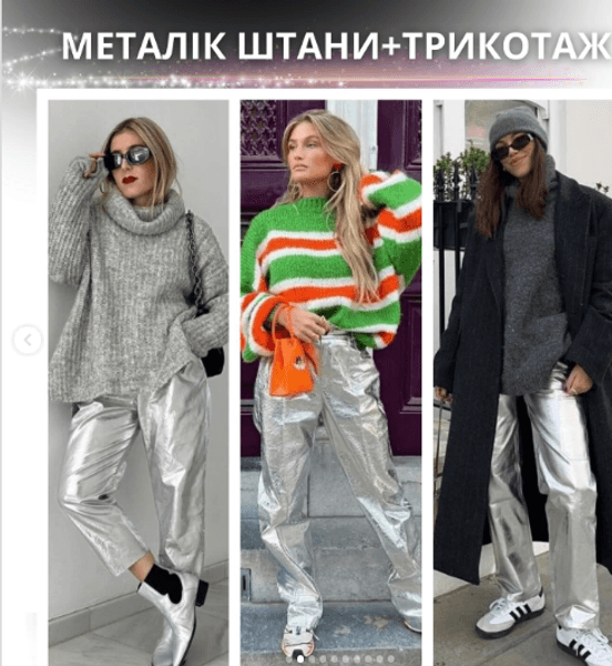 Штани кольору металік можуть виглядати дуже новаторськи в поєднанні з трикотажем і піджаком. Можна спробувати білий чи чорний трикотажний топ і класичний чорний піджак, щоб створити дивовижні контрасти в образі. Також можна додати кілька яскравих аксесуарів, щоб доповнити образ.