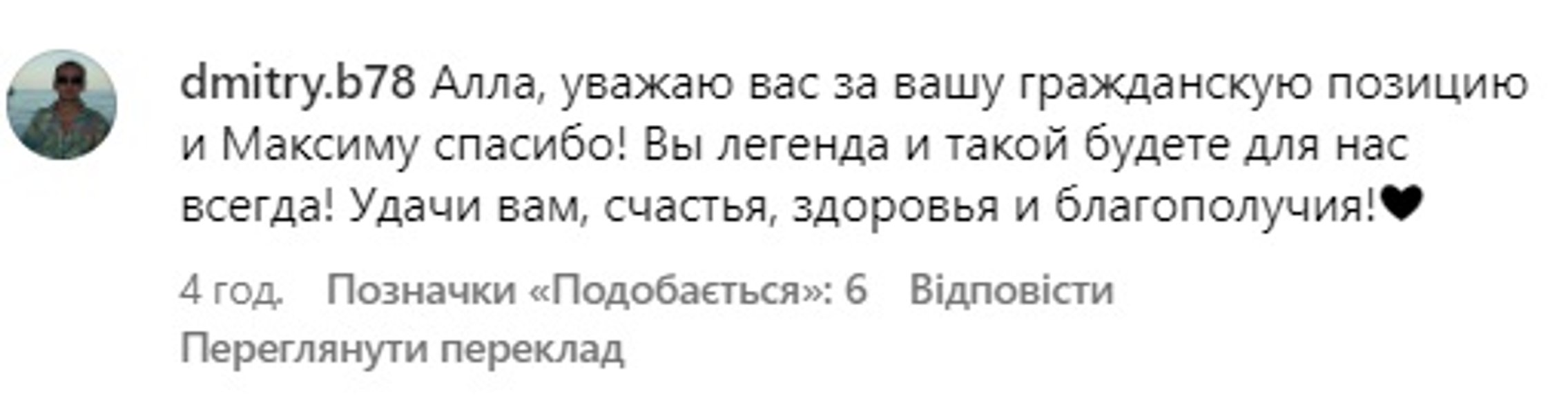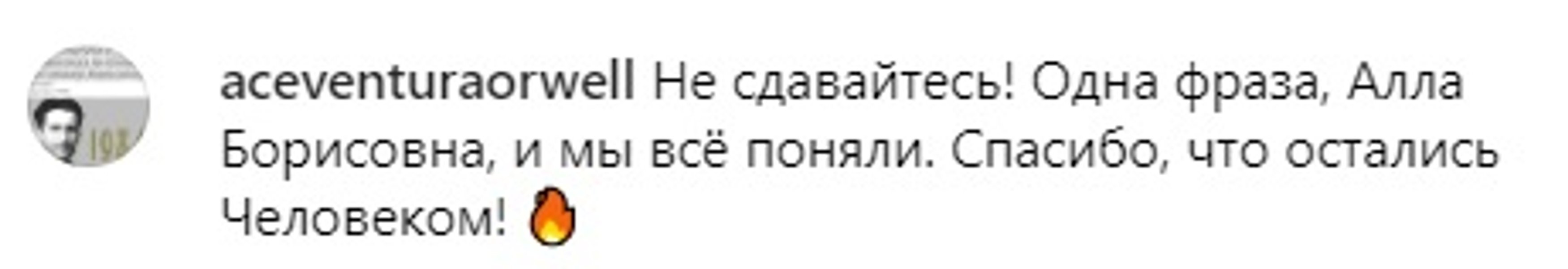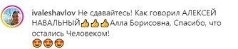 "Він не здавався і ми не здамося!", "Не здавайтеся! Одна фраза, Алла Борисівна, і ми все зрозуміли. Спасибі, що залишилися Людиною!", "Не здавайтеся! Як говорив Олексій Навальний! Алла Борисівна, спасибі, що залишилися Людиною!", "Алла, поважаю вас за вашу громадянську позицію і Максиму спасибі! Ви легенда і такою будете для нас завжди! Удачі вам, щастя, здоров'я і благополуччя!", — пишуть шанувальники артистки.