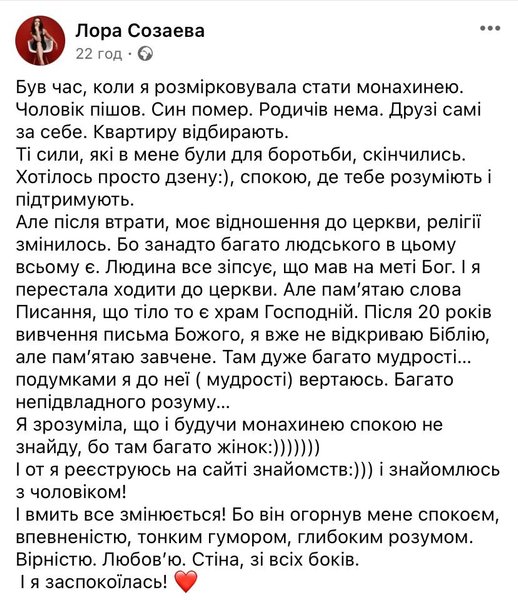 "Був час, коли я розмірковувала стати монахинею. Чоловік пішов. Син помер. Родичів немає. Друзі самі за себе. Квартиру відбирають. Ті сили, які в мене були для боротьби, скінчились. Хотілось просто дзену, спокою, де тебе розуміють і підтримують", — написала Лора.