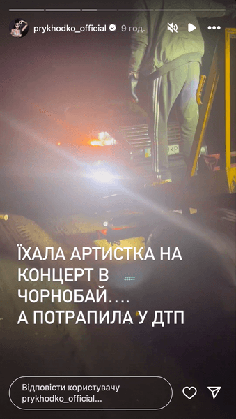 "Їхала артистка на концерт в Чорнобай, а потрапила в ДТП", — написала Анастасія Приходько, показавши кадри авто, яке забирав евакуатор.