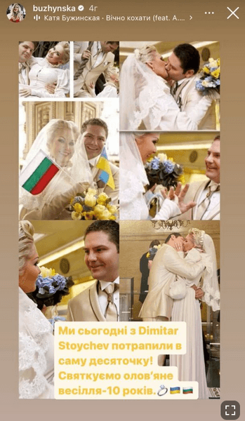 Українська співачка Катерина Бужинська 23 квітня відсвяткувала десяту річницю шлюбу зі своїм чоловіком, болгарським бізнесменом Дімітаром Стойчевим. На своїй сторінці в Instagram артистка опублікувала архівні фотографії урочистості.