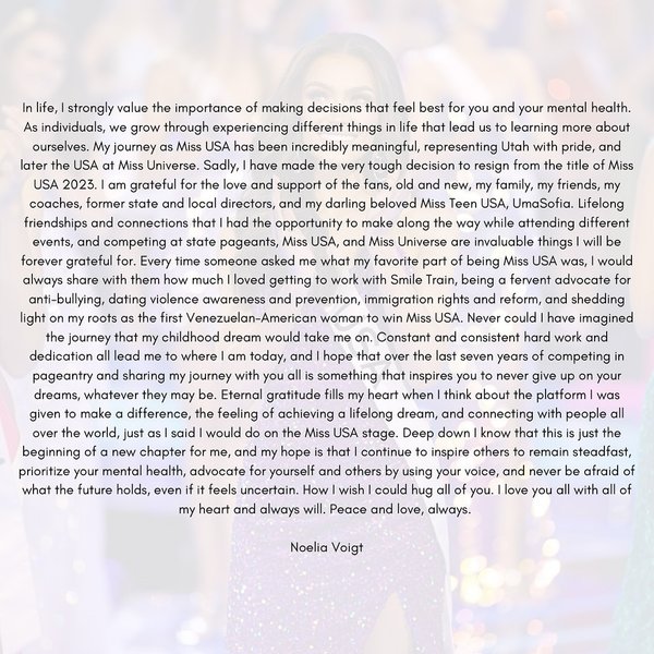 "У житті я високо ціную важливість ухвалення рішень, які будуть найкращими для тебе і твого ментального здоров'я. Як особистості ми зростаємо, проходячи через різні труднощі, які змушують нас більше вивчати себе. Моя подорож як "Міс США" була неймовірно значущою: я з гордістю представляла Юту, а потім і США на "Міс Всесвіт". На жаль, я ухвалила дуже важке рішення відмовитися від титулу", — почала вона своє повідомлення.