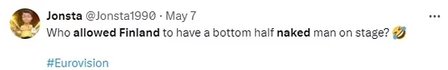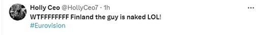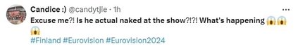 "Хаотичний, єдине, що залишилося на Євробаченні", "На Євробаченні 2024 немає правил", "Конкурс Євробачення вбили в цьому році...", "Не розумію такого гумору", "Вибачте?! Він справді голий на шоу?! Що відбувається", "Хто дозволив Фінляндії виставити на сцені напівголого чоловіка?", "Фінляндія??? Будь ласка, скажіть мені, що цей хлопець не голий?" — пишуть у коментарях.