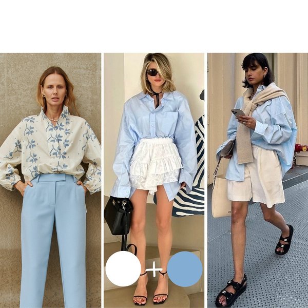 Це ніжна класика, яка завжди актуальна. Можна поєднувати білі шорти або спідницю та блакитну сорочку, або вдягнути блакитні штани з білим верхом.