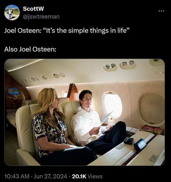 Інший користувач поділився фотографією Остіна, який сидить у своєму приватному літаку з дружиною і висміює цитування телеєвангеліста.