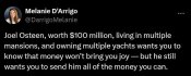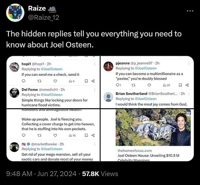 Хтось ще послався на чутки про зарплату проповідника в Лейквуді, попри неодноразові його заяви про те, що він відмовляється від щорічної зарплати на користь грошей, які він заробляє від продажу книг.