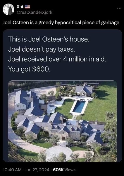 Проповідник і старший пастор дуже успішної церкви в Лейквуді може похизуватися статками щонайменше $50 мільйонів і володіє двома будинками в Техасі вартістю $10,5 мільйона і $2,9 мільйона. Перший із двох згаданих будинків, який розташований у Г'юстоні, містить басейн, будиночок біля басейну і три ліфти.