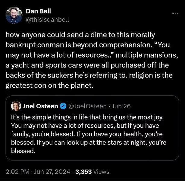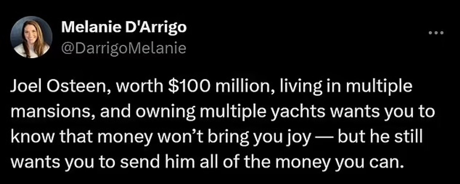 "Якщо ви можете дивитися на ці зірки з балкона свого особняка, ви — Джоел Остін", "Як хтось міг послати хоч десять центів цьому морально збанкрутілому шахраю, просто незбагненно", "Можливо, у вас не так багато ресурсів... кілька особняків, яхту та спортивні автомобілі купили коштом лохів, про яких він говорить", "Релігія — найбільше шахрайство на планеті", "Джоел Остін і Дональд Трамп — по суті, одна й та сама людина. Обидва фальшиві християни, які виманюють гроші у недоумкуватих", — пишуть під публікацією.