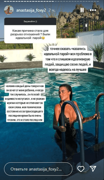"Точніше сказати "здавалися ідеальною парою". Моя проблема в тому, що я дуже ідеалізую людей, захищаю своїх людей і завжди сподіваюсь на краще. Людина кожен день говорила, як він хоче від мене дитину, і коли так сталося, він, судячи з усього, злякався. Я не поважаю чоловіків, які не відповідають за свої слова. Моє психічне здоров’я через те, що відбувалося, було поганим. Це і стало останнім. Я не розумію і не приймаю людей безвідповідальних, які не відповідають за слова і вчинки. Я ставлю великий хрест і прибираю з життя", — уточнила Анастасія Foxy.
